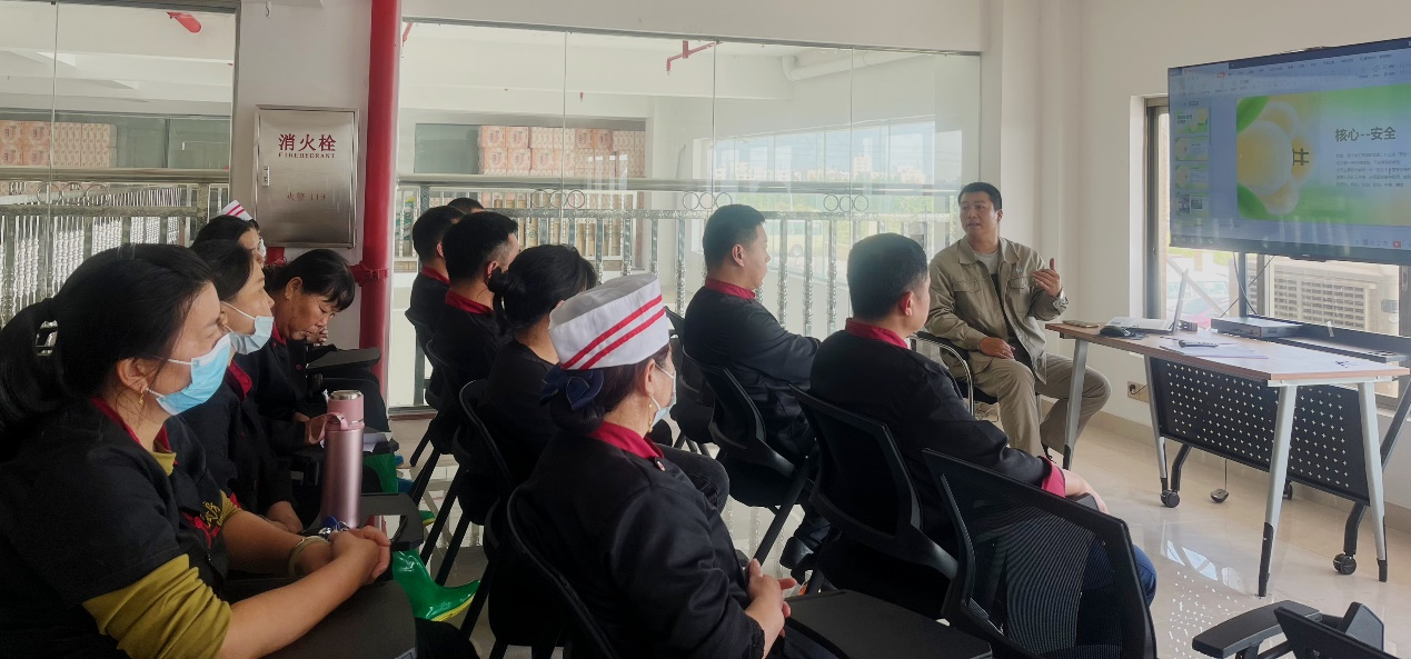 隨后,HSE管理部安全員朱宏杰于職工書屋對廚房工作人員進行安全教育,從廚房危險源辨識、事故預防、設備操作等方面詳細地進行講解,他強調:“大家一定要重視電、火、器具的使用安全,注意安全是對自己負責,也是對他人負責。在廚房無論進行什么工作都需要嚴肅認真,思想集中,比如在油鍋加熱過程中不可離開,在斬切食物時不得與他人交談,養(yǎng)成良好的習慣,確保自己和他人的安全。”